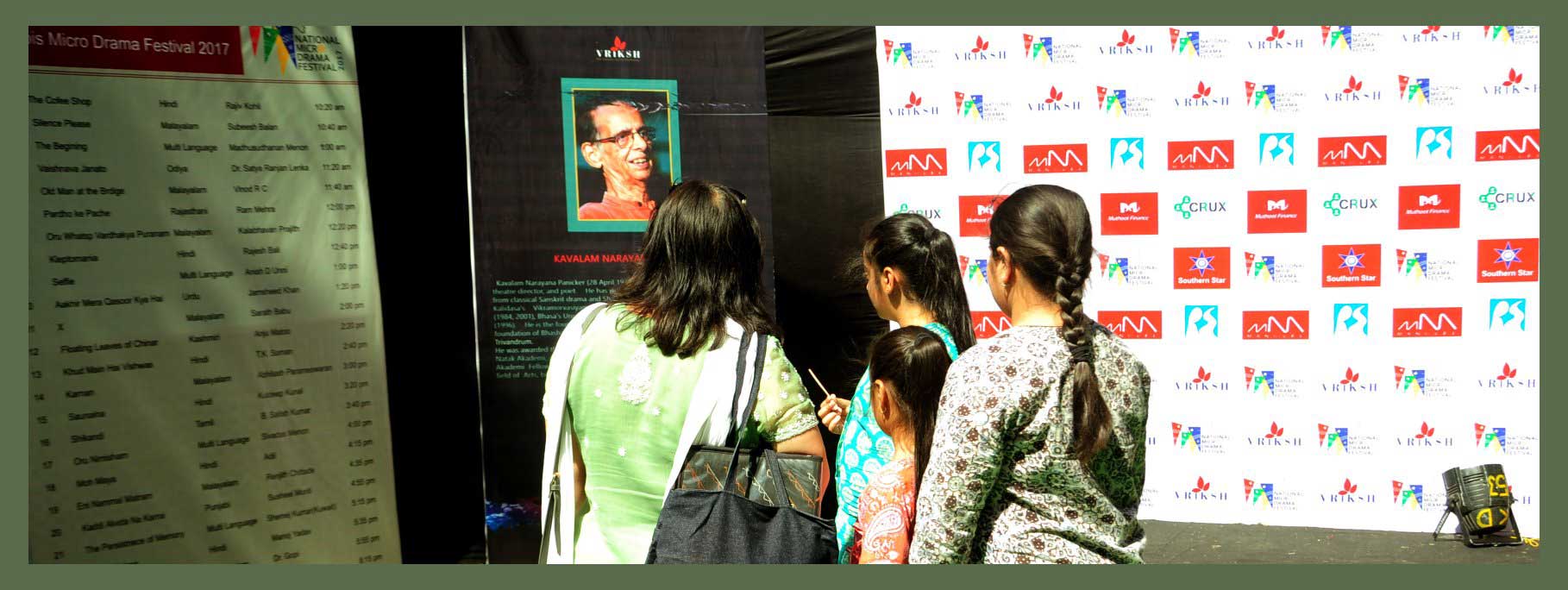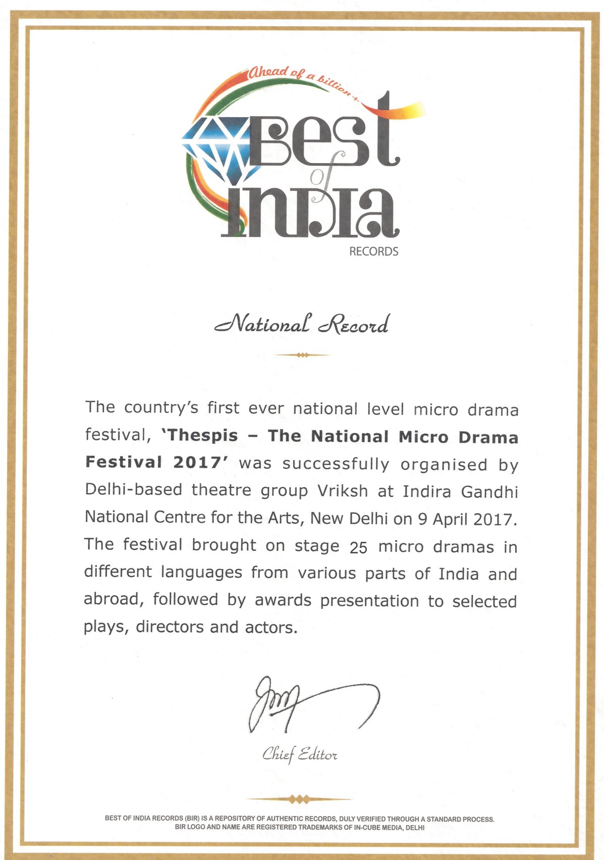 Vriksh the Theatre organized the first ever Micro Drama Festival in India. It was named as 'Thespis’, the National Micro Drama Festival which was held on 9th April 2017 at Indira Gandhi National Centre for the Arts (IGNCA) New Delhi, India. The festival was a tribute to Thespis of ICARIA, the first person ever to appear on stage as an actor.