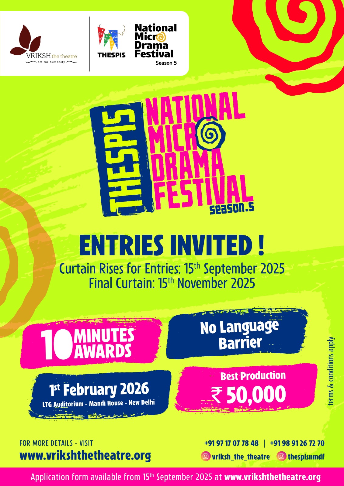 34. For any grievances relating to your participation in Thespis 2026 please send a mail to thespis.nmdf@gmail.com 35. For any further clarifications please contact: +91 9717077848, +91 9891267270 or log on to www.vrikshthetheatre.org