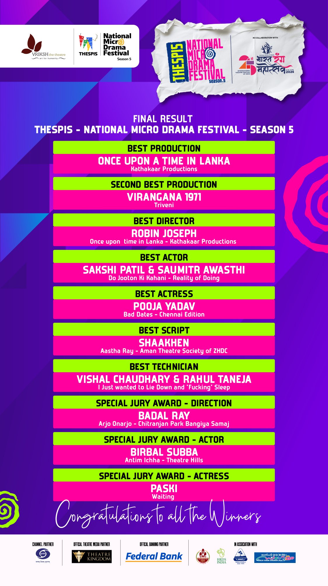 THESPIS NATIONAL MICRO DRAMA FESTIVAL - SEASON 5 - RESULTS Click here to download the PDF version of the Schedule. For any further clarifications please contact: +91 9717077848, +91 9891267270
